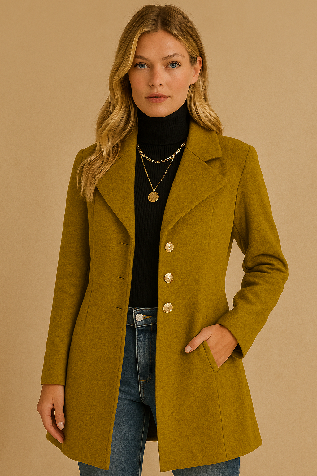 Laat je zien in stijl met deze elegante mid-length mantel voor dames in een opvallende mosterdgele tint. De getailleerde pasvorm en klassieke reverskraag zorgen voor een flatterende, vrouwelijke look, terwijl de gouden knopen een vleugje luxe toevoegen.