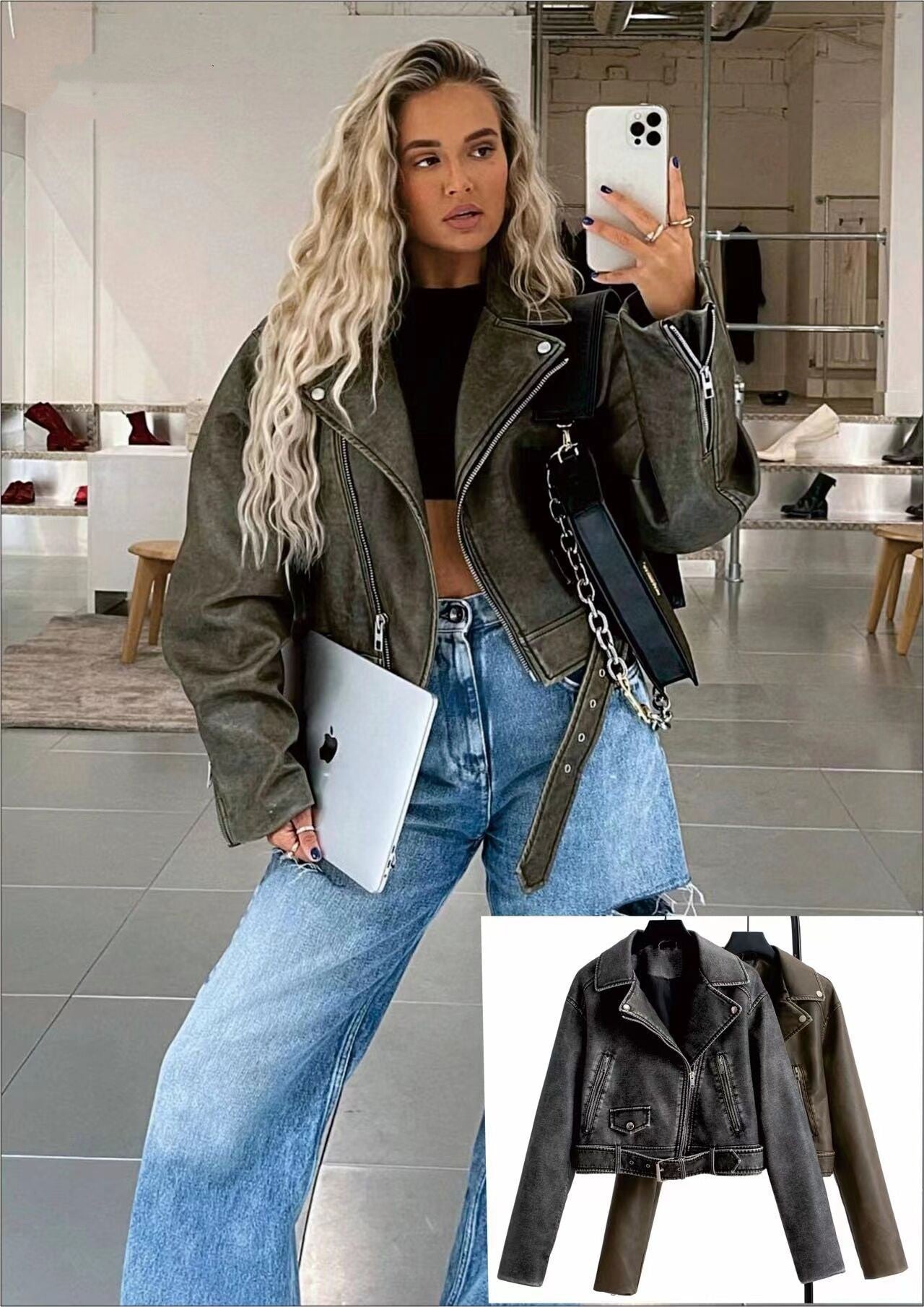 • Stoere bikerstijl met zilverkleurige ritsen