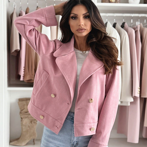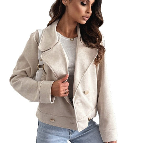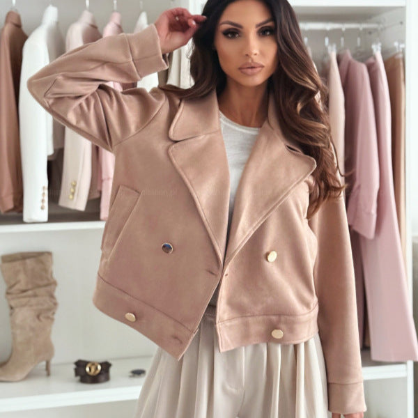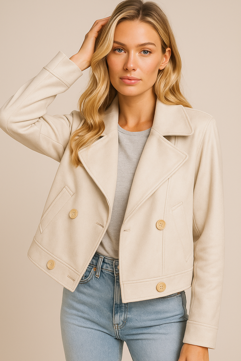 Deze korte jas voor dames is het toonbeeld van moderne elegantie. De dubbele knoopsluiting, klassieke reverskraag en zachte wolachtige textuur geven de jas een luxe uitstraling die perfect past bij elk seizoen.
