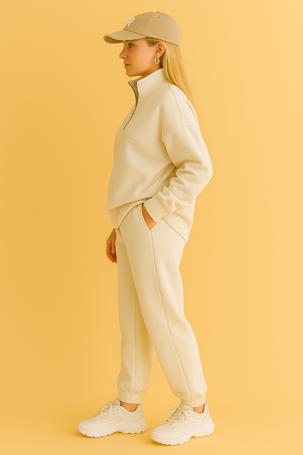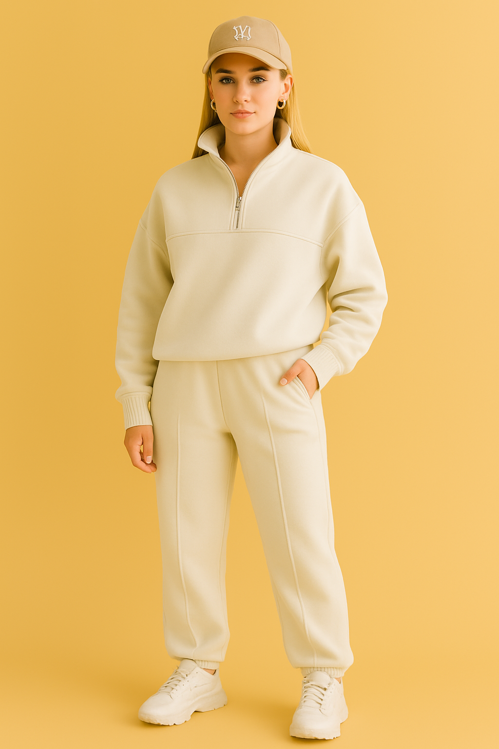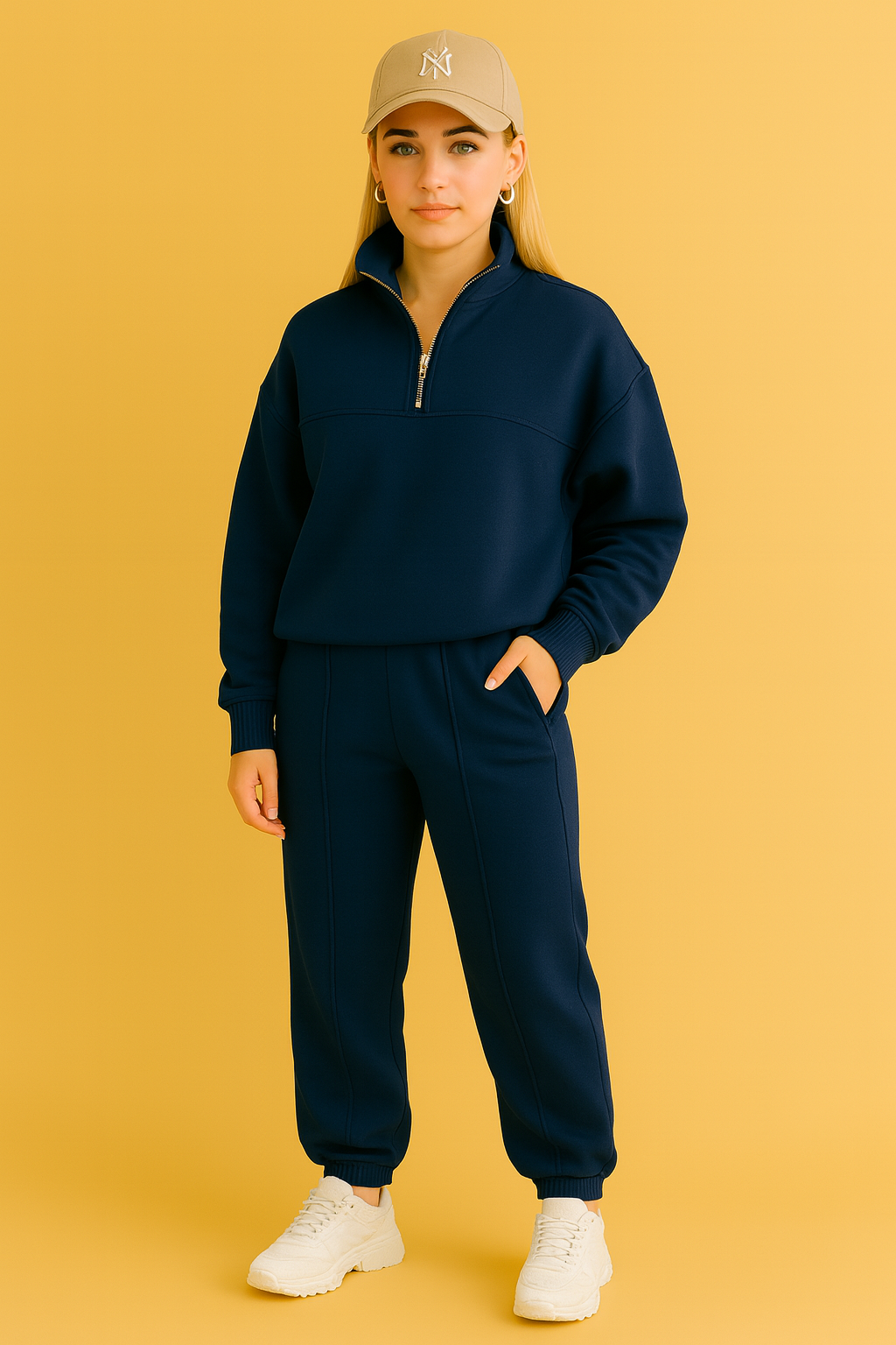 Voeg sportieve elegantie toe aan je garderobe met deze 2-delige dames trainingsset. De trui met korte rits en hoge kraag geeft een moderne uitstraling, terwijl de bijpassende broek met rechte pijpen zorgt voor een ontspannen pasvorm. Ideaal voor dagelijks gebruik, zowel thuis als onderweg.