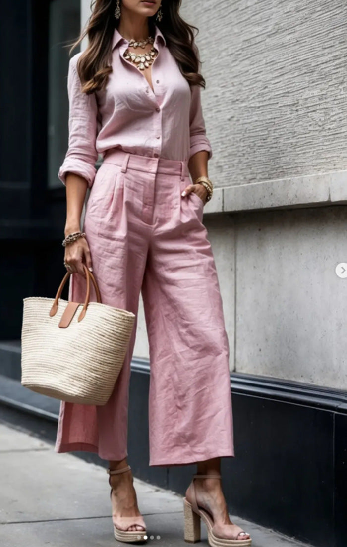 Deze dames set is de perfecte combinatie van klasse en comfort. De lange mouwen blouse met kraag straalt verfijning uit, terwijl de losvallende hoge taille broek met wijde pijpen zorgt voor een moderne, flatterende pasvorm. Ideaal voor een dag op kantoor, een etentje of een stijlvolle city look.