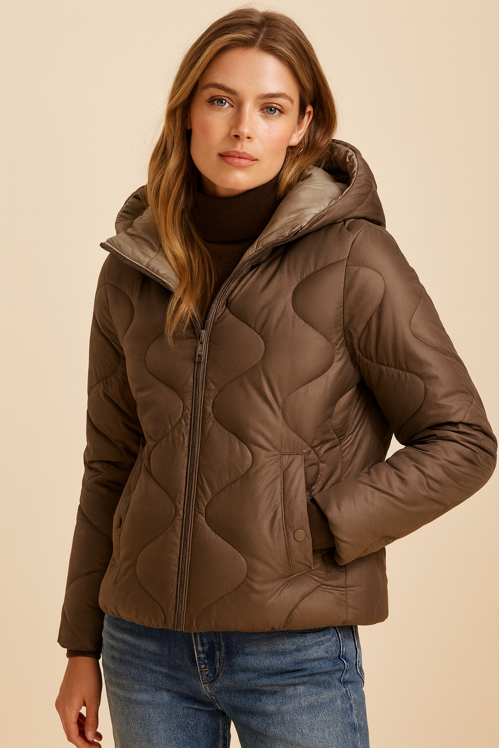 Deze gewatteerde jas met capuchon combineert warmte, comfort en een verfijnde uitstraling in één. De unieke golvende stiksels geven de jas een vrouwelijke vorm en een moderne twist. Dankzij de lichte, isolerende vulling blijf je heerlijk warm zonder dat de jas zwaar aanvoelt. De zachte capuchon biedt extra bescherming tegen wind en kou, terwijl de subtiele glans van de stof een luxe uitstraling toevoegt. Perfect voor zowel dagelijkse looks als stijlvolle winterdagen.