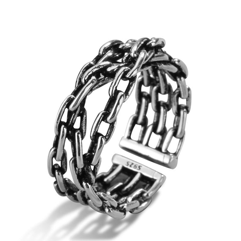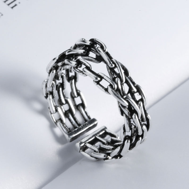 Deze gevlochten schakelring combineert kracht en elegantie in één opvallend ontwerp. Het meerlaagse schakeldesign geeft de ring een robuuste, vintage uitstraling, terwijl de verfijnde afwerking zorgt voor een stijlvolle en moderne touch. Een echte blikvanger voor wie houdt van karaktervolle sieraden.