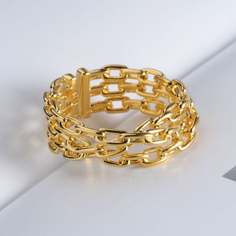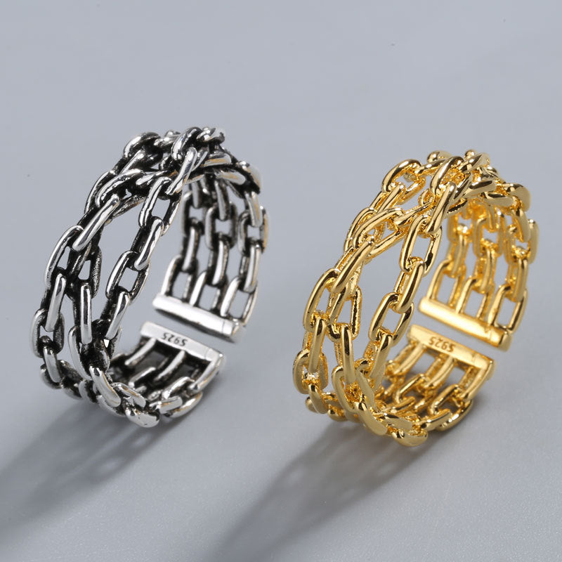 Dankzij het open en verstelbare ontwerp past de ring zich eenvoudig aan jouw vinger aan. De gevlochten schakels creëren een speels diepte-effect en zorgen voor een krachtige uitstraling zonder zwaar aan te voelen. Perfect om solo te dragen of te combineren met andere ringen voor een trendy look.