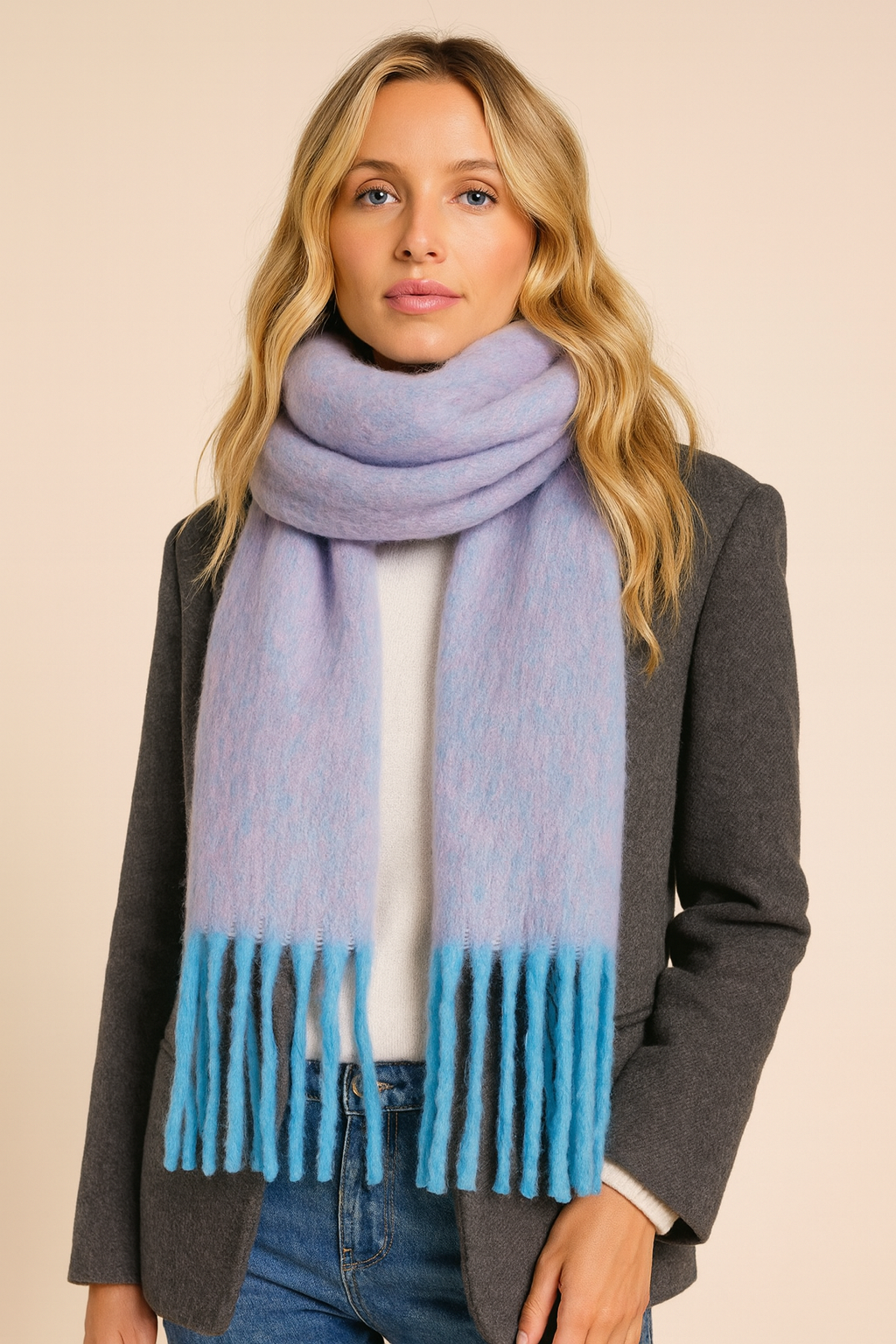 Deze zachte gebreide sjaal is een echte eyecatcher voor het koude seizoen. De unieke mix van lila en blauw geeft een frisse, moderne uitstraling, terwijl de dikke, wolachtige stof je heerlijk warm houdt. Dankzij de lange franjes aan de uiteinden krijgt de sjaal een speelse, modieuze twist. Perfect te dragen over je jas of cozy om je nek gewikkeld – stijlvol én comfortabel tegelijk.