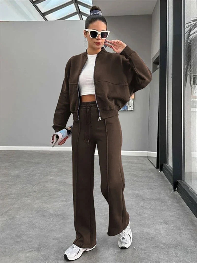 Deze dames set combineert ultiem comfort met een moderne, minimalistische uitstraling. De fleece cardigan met ritssluiting en de rechte broek met hoge taille vormen samen een stijlvolle en tijdloze look die ideaal is voor zowel binnen als buiten de deur.