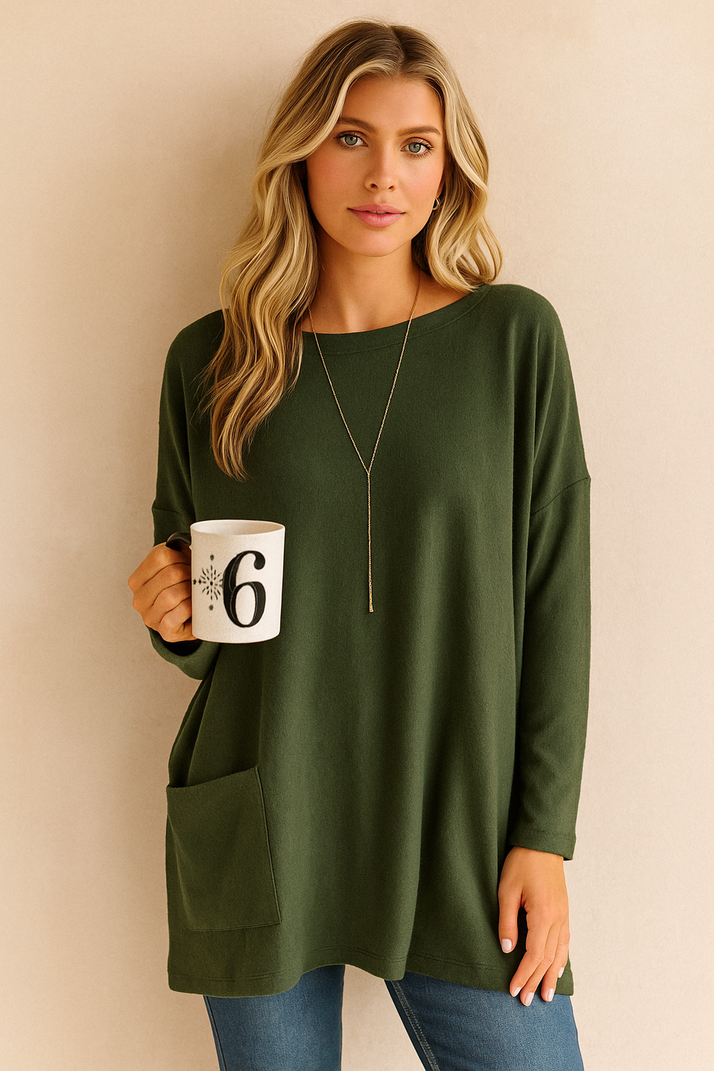 De diepgroene kleur geeft een rustige, natuurlijke uitstraling die makkelijk te combineren is. Deze casual dames top is een echte must-have voor het najaar en winterse dagen waarin comfort en stijl samenkomen.