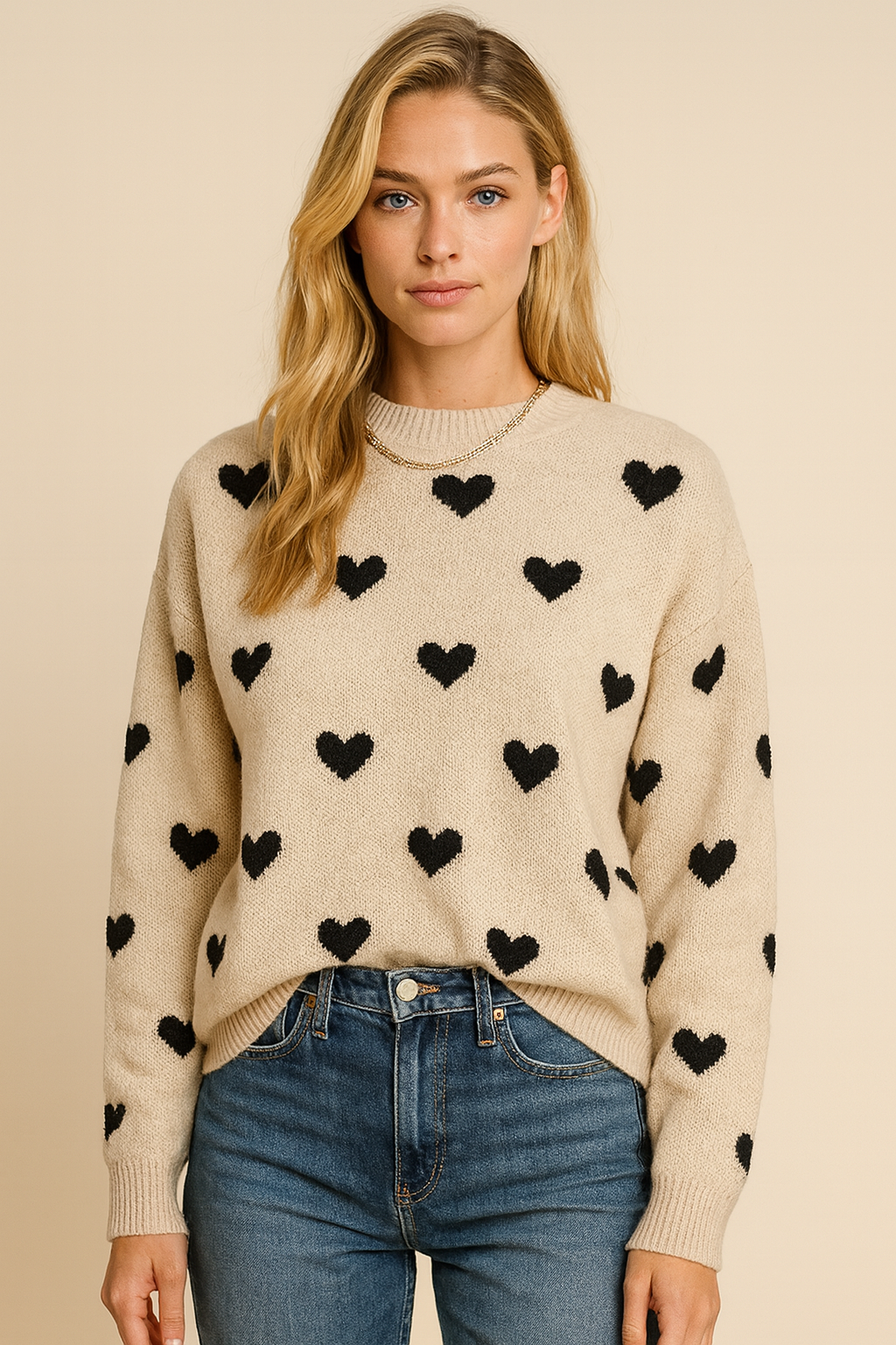 Deze zachte gebreide trui met hartjesprint is de perfecte combinatie van comfort en vrouwelijkheid. De ronde hals en lange mouwen geven de trui een tijdloze uitstraling, terwijl het speelse hartjesmotief zorgt voor een frisse, moderne look.