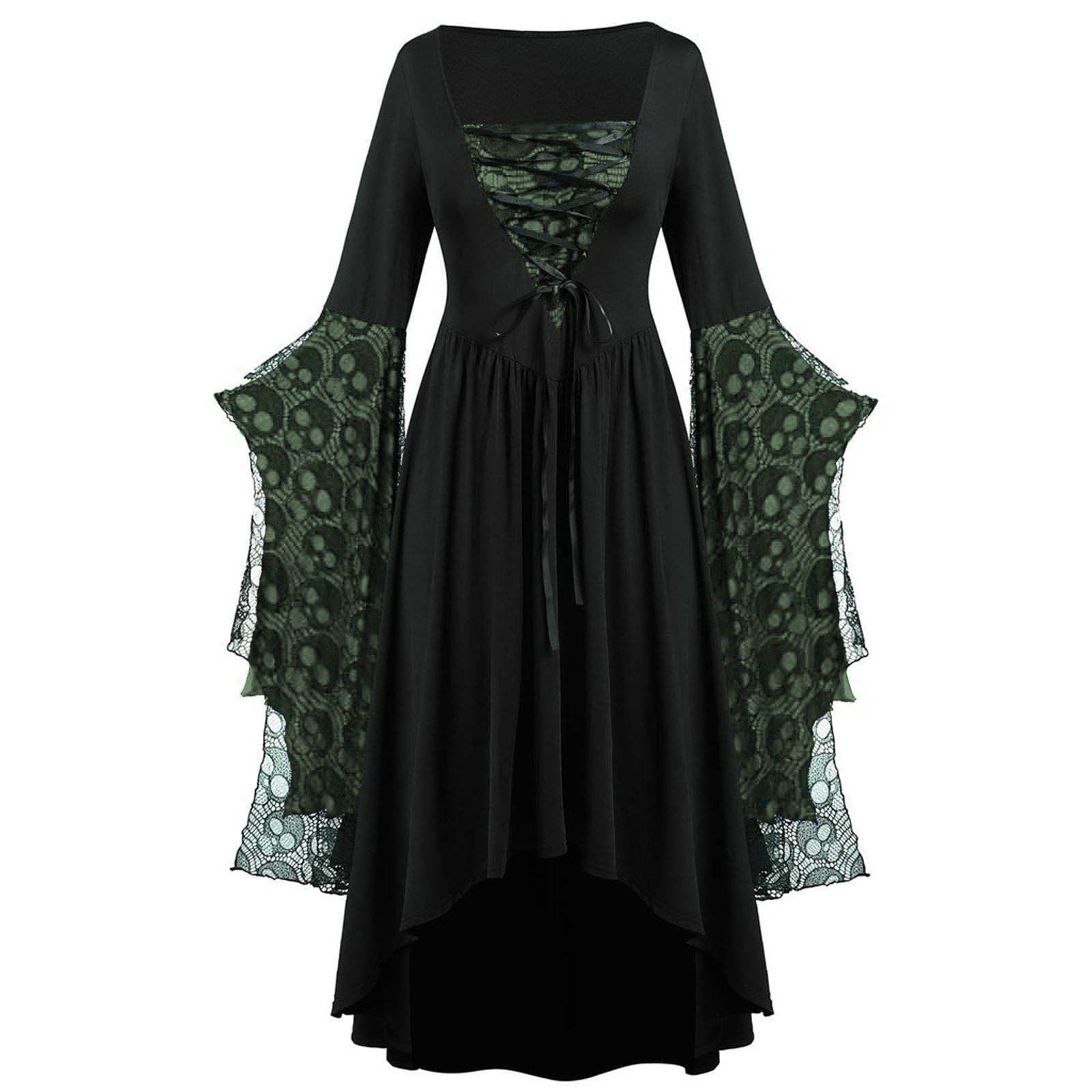 Breng een vleugje mysterie en elegantie in je garderobe met deze opvallende dames jurk. Het speelse design met onregelmatige zoom en kanten details aan de mouwen geeft de jurk een unieke uitstraling. De vierkante halslijn met veterdetail maakt dit model perfect voor wie stijl en karakter wil combineren. Ideaal voor themafeesten, speciale gelegenheden of gewoon wanneer je een statement wilt maken.