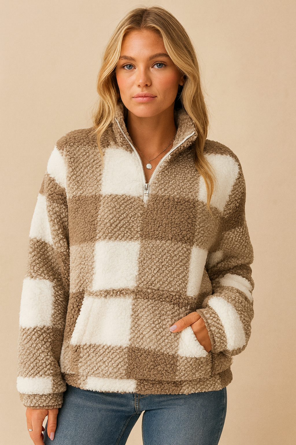 Deze heerlijke geruite fleece trui voor dames is perfect voor koude dagen. De teddyzachte stof voelt supercomfortabel aan en houdt je lekker warm, terwijl de halve rits en hoge kraag zorgen voor een trendy, sportieve look. Het beige-witte ruitpatroon geeft de trui een moderne, stijlvolle uitstraling – ideaal voor een relaxte winterdag of een casual city walk.