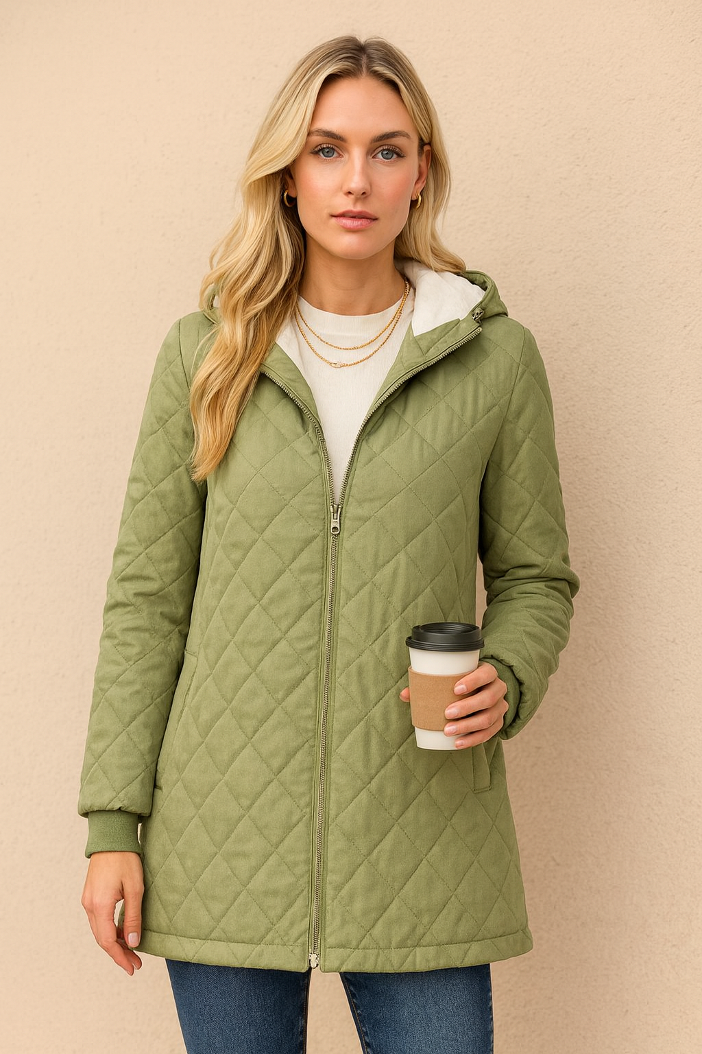 Deze stijlvolle gewatteerde damesjas met capuchon is de perfecte combinatie van warmte, comfort en een elegante uitstraling. De zachte fleece voering zorgt voor extra warmte tijdens koude dagen, terwijl het diamant-gestikte design een moderne en verfijnde look geeft.